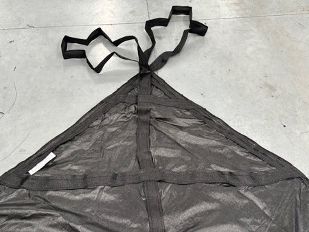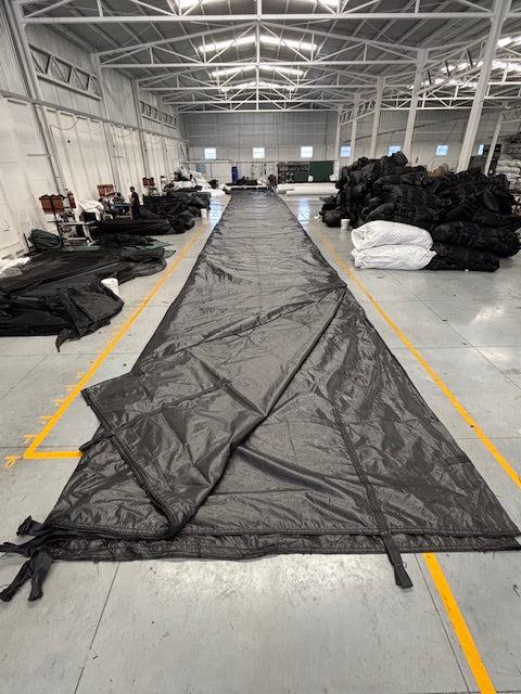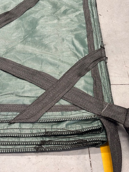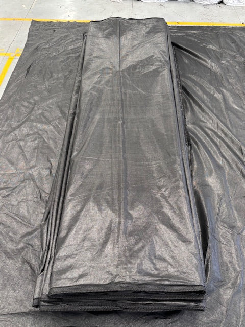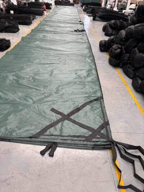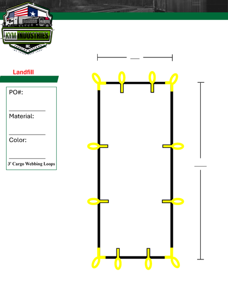 Our Landfill Tarps are made for extreme conditions & very durable. This landfill cover is made for 2 Pieces of Equipment to deploy such as compactors, dozers or even Trackhoes. Our Landfill Tarps are all 100% USA Made from raw material to labor. We recommend attaching an old tire to the corner pulls and then attaching a different strap from the tires to the working equipment. These tires will act as a spring and will give the driver a visual to see how much torque they are putting on the corners in order to not tear the tarp. These tires will give both drivers a visual as to when they need to correct the steering of the equipment and be able to correct the amount of torque they put onto the tarp. If using a track hoe to deploy the tarp, then just grab the tire with the track hoe and not the tarp in order not to tear the tarp while covering or uncovering as shown in photos attached.