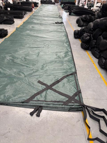 Our Landfill Tarps are made for extreme conditions & very durable. This landfill cover is made for 2 Pieces of Equipment to deploy such as compactors, dozers or even Trackhoes. Our Landfill Tarps are all 100% USA Made from raw material to labor. We recommend attaching an old tire to the corner pulls and then attaching a different strap from the tires to the working equipment. These tires will act as a spring and will give the driver a visual to see how much torque they are putting on the corners in order to not tear the tarp. These tires will give both drivers a visual as to when they need to correct the steering of the equipment and be able to correct the amount of torque they put onto the tarp. If using a track hoe to deploy the tarp, then just grab the tire with the track hoe and not the tarp in order not to tear the tarp while covering or uncovering as shown in photos attached.