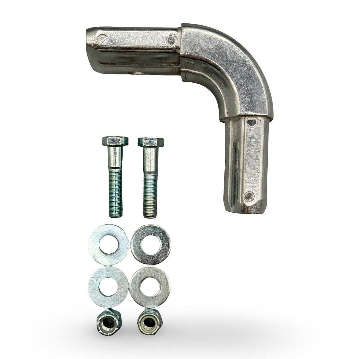 The aluminum 90-degree corner connects the tarp system upper arm to the cross tube.