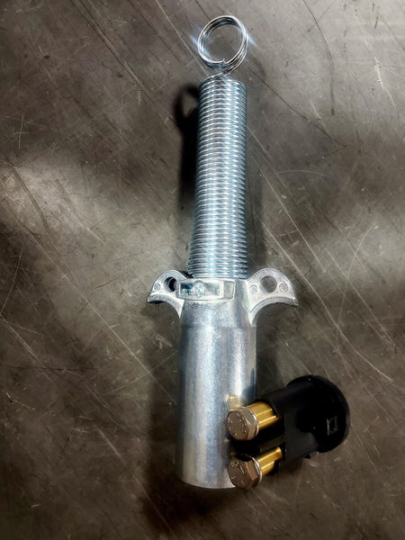 This item includes the vertical dual pole connector plug and socket. This is used to disconnect the tarp motor from the truck efficiently. The method of connecting the 6GA wires is considered a pass through set screw style.