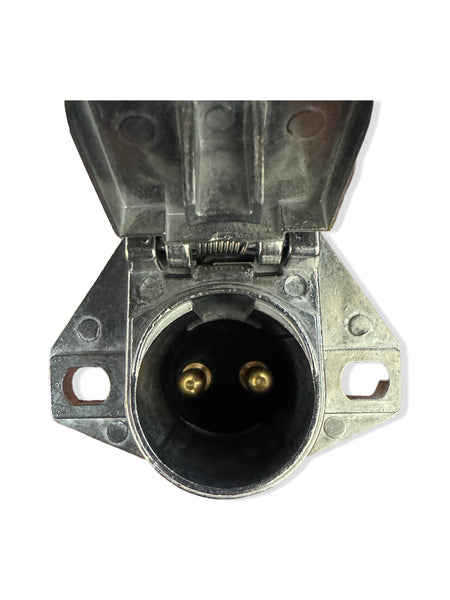Horizontal dual pole connector socket only. This horizontal plug socket is great for tractors that need to detach from their trailer every night or every now and again. This socket is rated from 6V to 24V and UP TO 200A. We recommend running 12V and 50A MAX but the socket is capable of handling more.