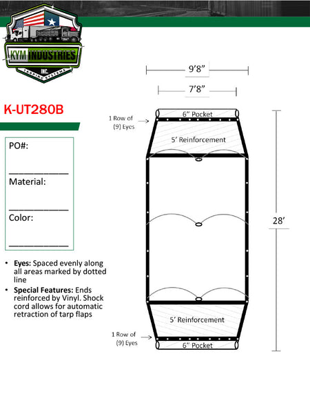 9'8" wide X 28' long flaps fold in to accommodate 8' width