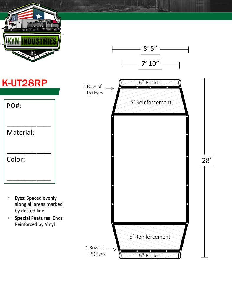 8'5" Wide that tapers to 7'10" wide X 28' Long. Flaps fold in to accommodate 8' width