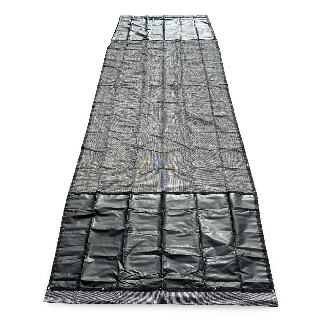 Multi-Mesh universal auto tarp with flaps for waste Roll-Offs and refuse trucks. This tarp will fit systems like the Pioneer Rack and Pinion and similar auto tarp systems.